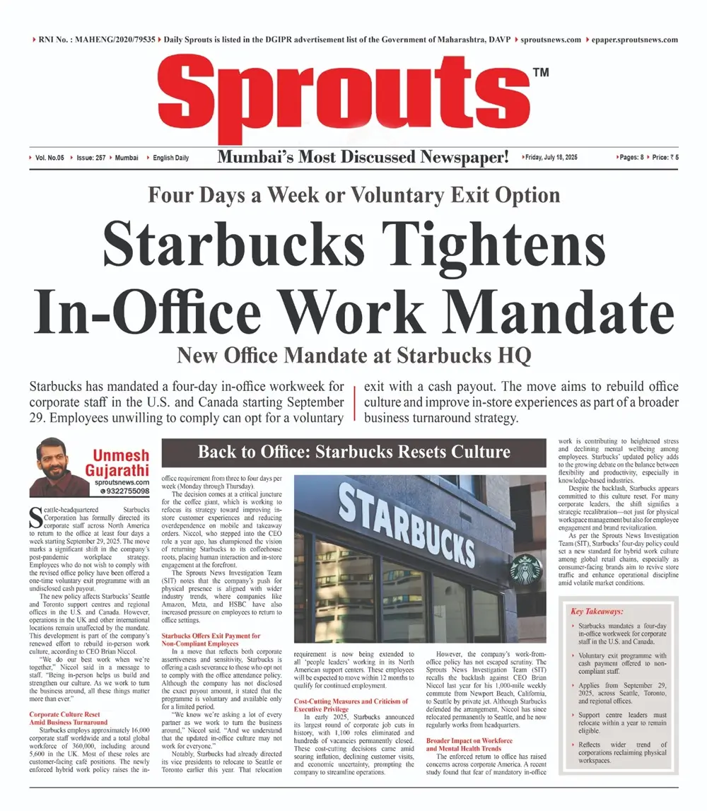 As per the Sprouts News Investigation Team (SIT), Starbucks’ four-day policy could set a new standard for hybrid work culture among global retail chains, especially as consumer-facing brands aim to revive store traffic and enhance operational discipline amid volatile market conditions.