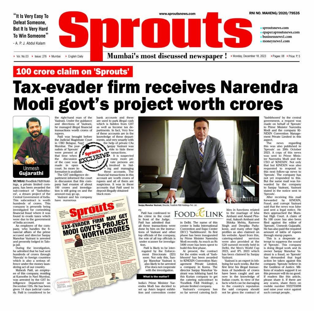 Vazirani is an expert in lobbying for such works. But the first time his illegal transactions of hundreds of crores have been caught and are now in the knowledge of Indian courts. In view of the facts which can be damaging to the country’s reputation the said company should not be given the contract of ‘Yashbhoomi’ by the central government, a request was made on behalf of ‘Sprouts’ to Prime Minister Narendra Modi and the company KINEXIN Convention Management Private Limited in this aspect.