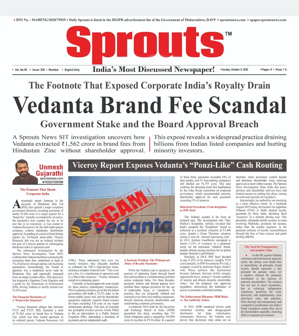 The subsequent investigation by the Sprouts News Investigation Team (SIT) confirms that Vedanta had been systematically extracting these fees, sometimes as high as 3% of turnover, through ad-hoc sub-licensing agreements. Astonishingly, the ‘brand’ in question was a trademark never used by Hindustan Zinc and reportedly managed from an empty London office. This discovery has triggered a Supreme Court litigation and a probe by the Directorate of Enforcement (ED), forcing Vedanta to hastily refund over ₹1,030 crore.